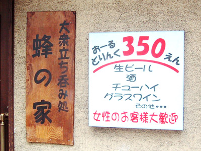 ちょっと、帰りに一杯ひっかけまひょか。 「のんでこ屋」 標準語なら「のんでいこうか?」との問いかけに相当する読みがこの屋号。 たのしい居酒屋と自称、カラオケ1曲100円だそうです。カラオケが嫌いなので入れません(