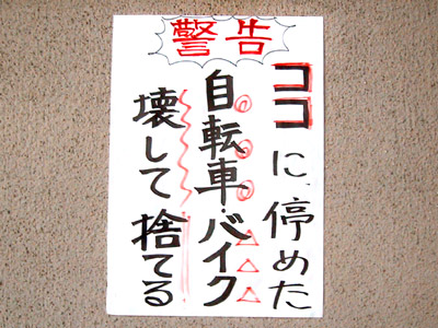 注意看板にいたずら。でも、これは笑えますのでそっとしておいてください。 注意看板 スロープは自転車は下りて押してください 坂道を歩行者と混在して通行する狭い目の路の場合、思わぬ事故に繋がる可能性もあり自転車は下りて押し、