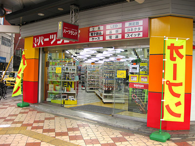 なかなか流浪の店舗です。 パーツランド 堺筋の南の方、旧シリコンハウス近辺にあった店舗が電子部品店舗集中エリアに移転しました。 旧OAシステムプラザ、リサイクル23と入っていたビルの1~2階にテナントとして移転。