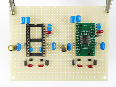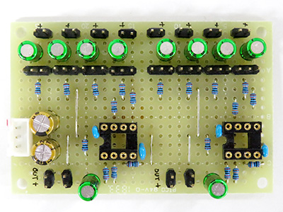 切替ではなく同時に複数入力をモニターしたかったので。 ミキサー基板 切替器という手もあったのですが、いちいち入力切替するのが面倒臭いのでミキサーに。 回路はオペアンプの加算回路の作例みたいなオーディオ・ミキサーで