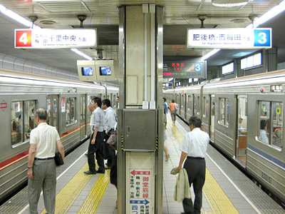 同じ駅で違う行き先の列車が来ます。 大国町駅(千里中央・西梅田方面のりば) 東京の地下鉄(メトロ)も大概ではありますが、大阪の地下鉄を複雑化している一翼を担うのがこの大国町駅。 南北を走る御堂筋線と四つ橋線が接続