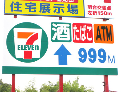 やっぱり999m。以前の場所とは違いますが。 コンビニまで999m 約1kmではなく、999m。本当にちゃんと距離を測ったのかと確認したいところ。 看板そのものが大きいので、看板の端に移動した段階で1000mにな