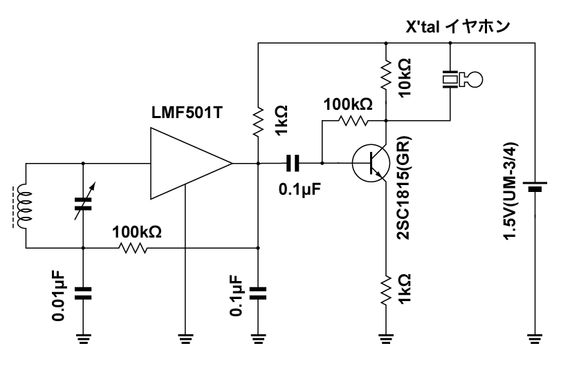 今回はクリスタルイヤホンで聞くことを前提に回路を組んでみました。出力にはLMF501Tの出力をクリスタルイヤホンで聞ける状態にするために2SC1818(GR)で1段増幅します。