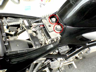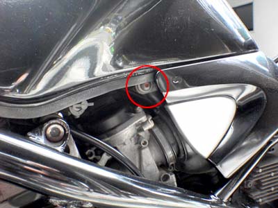 タンクとサイドカバーはグロメットで結合しており、タンクが外せませんのでサイドカバーも外します。赤丸で示したネジを4mmの六角レンチで外し、さらにタンクとフレームに結合しているグロメットを外してサイドカバーを外します。