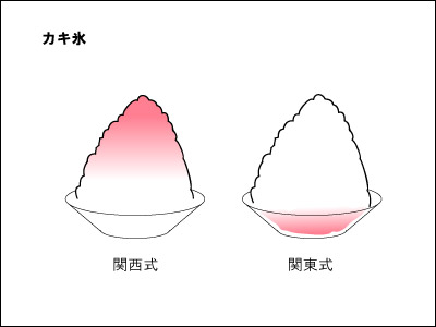 大阪のカキ氷はフラッペの場合も含めて氷の上から蜜をかけます。それに対して関東圏では蜜を入れてから上から氷をかけます。大阪版は最初から蜜の甘い味を楽しめるのですが、関東版では最初は氷の味しかしません。