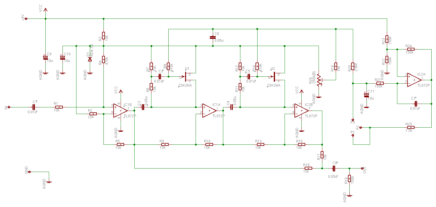 さて、いわゆる空間系と呼ばれるフェーザーです。元はMXRのPhase45のようです。なにが45なのかというと、CR位相回路が2段なのでそうなのかな?と思うのですが。別モデルでPhase90(こちらは4段)というのがあるのでそうだと考えたのですが、実際は今回の回路中の位相回路1段で+90度位相が変化するので、なぜ45なのかはよく解りません。