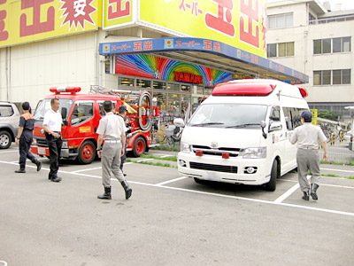 当日は消防署からかなりの人数で講習の指導のためにお越し頂きましたが、出動要請が掛かればそのまま移動できるように、消防ポンプ車と救急車の各1台で来場されていました。