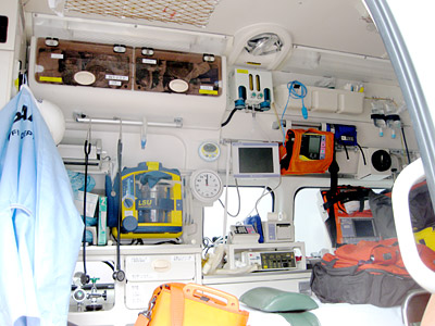 心電図の出るタイプのAED、酸素吸入器、聴診器や心電図プローブ、お産のセット、ディスポーザブルの衣類など機材類でいっぱいであり、かなり大きい車体にもかかわらずキャビンはそれほど広くありません。さらに運転席と助手席の間は無線機材や端末画面などがあり、座席周りもかなり窮屈な状態で、お世辞にも快適な走行をできるとはいえない状態です。