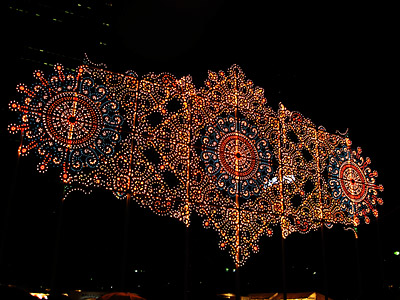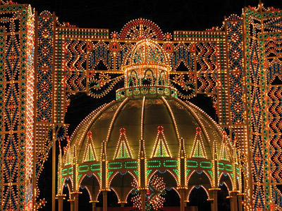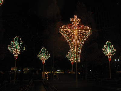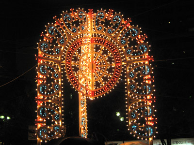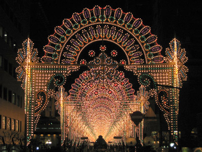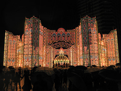 使用している電球の数は約20万個だそうで、電力も万kw単位で消費。LEDでの省電力のイルミネーションが展開される中、電球のもつ温かみ・色を求めて普通の電球で作品が作られているとのこと。LEDなら1/10ぐらいになるのではないでしょうか。