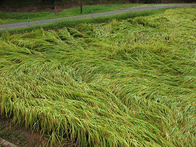 強風によって倒れてしまった収穫前の稲。これは農家としては大変悔しい思いをしていると思います。稲穂も垂れて収穫直前だったものが倒れてしまい、これでは収穫できない状態になってしまっています。