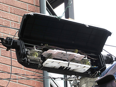 黒いクロージャーはメタルの電話線のためのもので、架空配線されている幹線から各戸へ電話線をつなぐ際にこの中で幹線と戸別配線を接続するために設置されています。グレーのクロージャーは光回線用のもので、同様に幹線から戸別配線への接続に使用されます。