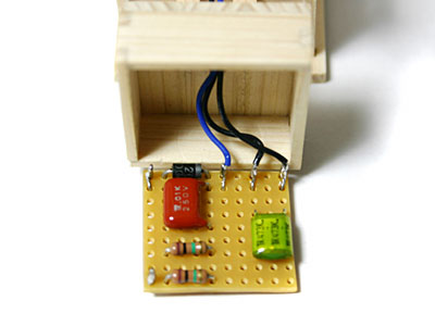 また、紙面の作例では昇圧・整流後の線をネオンランプまで伸ばすようになっていましたが、こちらではトランスからの昇圧出力を行灯まで伸ばし、行灯の下の台で整流・点灯回路を組み込んでいます。
