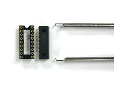 しかし、仕事ではなく個人で「使うのは、18pinのPICメインなだけどなー」となると、ちょっと引いてしまう金額の工具なのでモヤモヤとしていたのですが、シリコンハウスのレジ横で「おっ!」と見つけました(商売うまいなぁ)。幅もどう見ても18pinか20pin用。造りのチャチさはさておき、とりあえず価格につられて購入してしまいました。