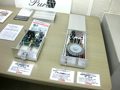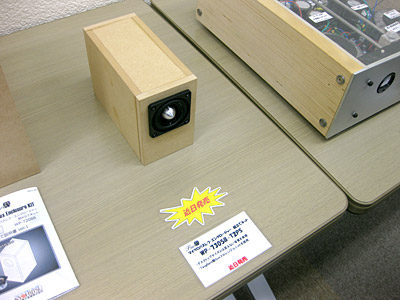 近日発売予定である5cmのスピーカーユニットを使ったスピーカーユニットのキットとTA2020-20アンプなどで要望の多かったトランスを使った電源ユニットと電源基板パーツセットが陳列されていました。