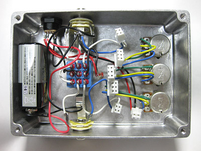 ケースに部品を実装してから内部配線にかかります。エフェクターの作成の時間配分を考えると、プリント基板で製作する場合は基板1/4、ケース1/4、残り1/2が筐体内配線といったところでしょうか。プリント基板ではなくユニバーサル基板で製作するとたぶん、基板1/2位のウェイトになります。