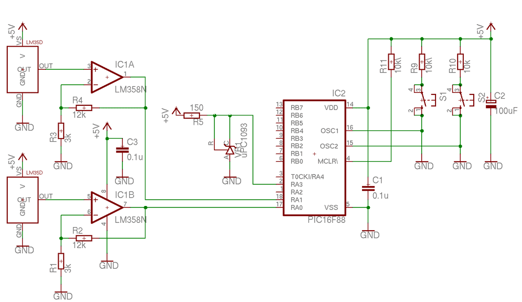 回路は非常に単純です(回路図)。0℃〜150℃までの範囲を計る事の出来る摂氏直読式センサーであるLM35DZは温度出力を10mV/℃で出力します。しかし、このままでは電圧が小さいためPICの内蔵A/Dの10bitレンジでは精度が悪く実用に堪えられないため、実用範囲いっぱいまでに出力電圧範囲を広げるためにオペアンプで増幅するします。