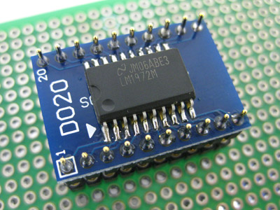 パッケージがSOP 20ピンであるため、そのままだと2.54mmピッチのユニバーサル基板に実装できません。今回はダイセンの20ピンICピッチ変換基板(D020)を使いました。一般的には28ピンの変換基板が多く出回っているのでそちらの方が入手性はよいと思います。
