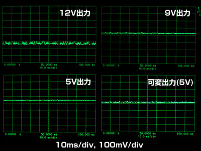 9V、5V、LM317による可変電圧出力はこのスイッチング電源の出力を元にドロップダウンしています。さすがにレギュレーター出力はノイズ抑制がされていてかなり静かな状態です。