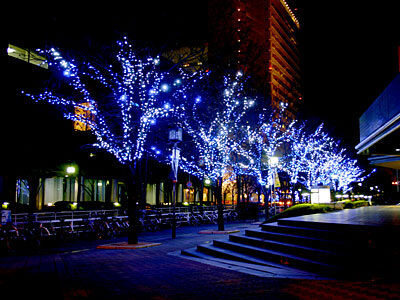 今年のツイン21はクリスマスの電飾はありませんでしたが、外ではこんな感じで光る街路樹に変身してしまっています。ヒルトン大阪のように通年点灯しているようになるのでしょうか・・・。