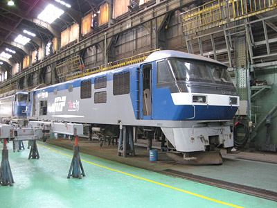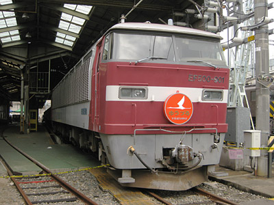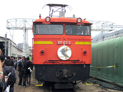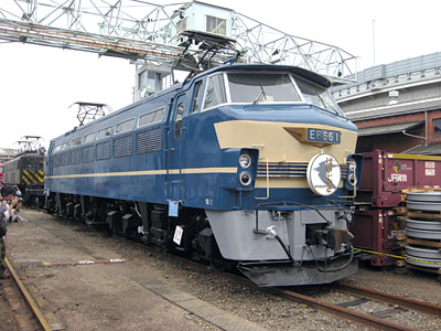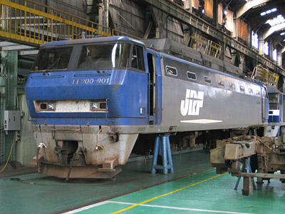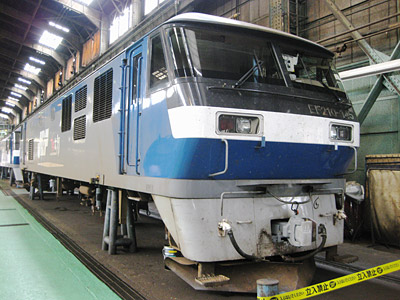 改修中の機関車として展示。EF200形電気機関車の試作機で、取付屋根が大きいのと灯火部の周りが灰色な点が特徴です。