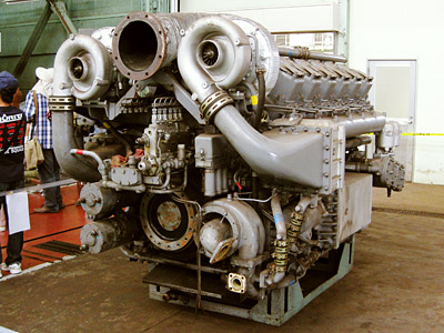 DE10に搭載されている総排気量61L超のV形12気筒インタークーラ付きターボディーゼルエンジンです。過給器の大きさといい、エンジンそのものの大きさと良いド迫力です。
