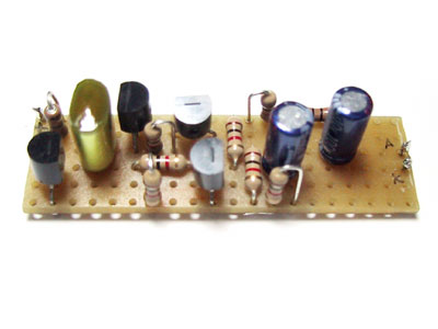 トランジスタをTO92パッケージの2SA1015/2SC1815ではなく、もっと小さいパッケージの2SA1048/2SC2458に、抵抗も小型の1/4W抵抗や10Ω以外は1/6Wの小型抵抗に、100μFの電解コンデンサーは6.3V定格の超小型電解コンデンサーにするなど小型部品への変更を行うとかなりケース内の余裕ができますので、さらに小型化も可能だと思います。