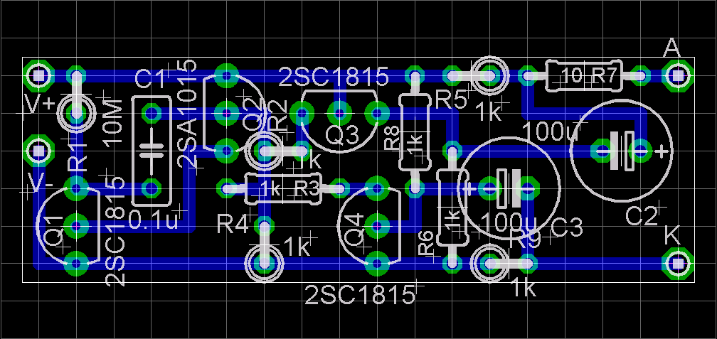 通常サイズの1/4W炭素皮膜抵抗と100μF/10Vの電解コンデンサ、0.1μFフィルムコンデンサと、今回は小型化に際して部品サイズが通常の部品でもなんとか収まるように基板を小さく作成しました。基板レイアウト・配線図はこちらをご参照ください。