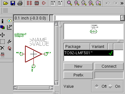 また、TO92のパッケージ形態を持っているLMF501Tも、2NXXXXのライブラリから持ってきたレイアウト情報からECBの端子を変更して、図面のシンボルを作り、ライブラリ化しました。