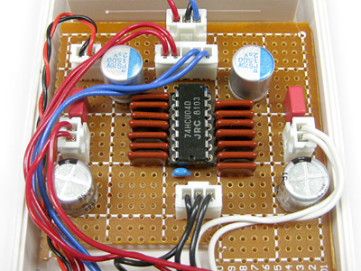 出力のカップリングコンデンサは東信のJovial、電源のデカップリングコンデンサにはニチコンの導電性高分子固体電解コンデンサの2.5V/1,500μF、抵抗類はすべてニッコームの金属皮膜抵抗であるRP-24で組み上げました。