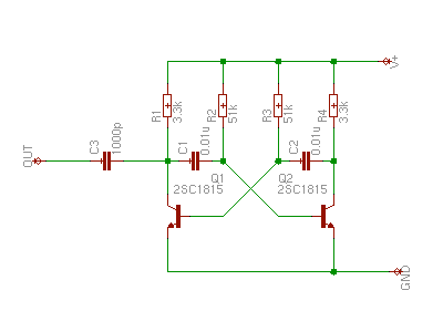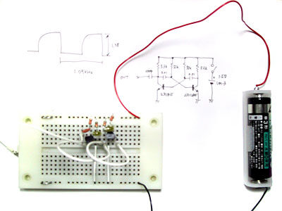 ブロッキング発振か無安定マルチバイブレーターで発振回路を組み、その出力をコンデンサーで直流成分カットして取り出します。発振回路の出力はきれいな波形ではない事から、かなり基本周波数以上の高調波を含み、AFからRFまでの信号注入源として利用できます。単三1.5Vを電源とした場合、基本発振周波数は約1kHz、振幅は1.3Vほどです。低周波回路には十分利用できる感じですね。(回路図はこちら)
