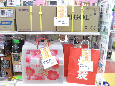 小物はいろいろ。エフェクターのキットに筐体までそろった一式セットや、オペアンプ聞き比べセット、お部屋で聴くアンプ+スピーカセット2万円などオーディオ系の福袋が多く並んでいました。