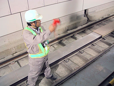 説明中の方の後方にあるのがリアクションプレート。この新線は長堀鶴見緑地線と同じくリニアモーターを採用した車両形式で運行されます。軌道上のリアクションプレートと車両のコイルとの間で通常のモーター同様に吸引反発を行うことで前進します。