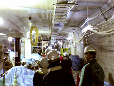 上記の説明を受けていた場所からさらに1階下りますと、改札の予定場所に到着します。当然コンクリートは打ち放し、あちこちに鉄筋がニョキニョキと生えている。工事用の電力線などもそのまま這い回されておりなかなか「現場」の雰囲気を味わえます。