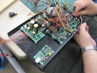こちらはバラック組みをしていたものからケース入れのために全ての配線を外して筐体加工し組み直しをしていらっしゃいました。配線量が半端無いのでかなり苦労されている様子。独立実験基板の組み合わせのデジタルオーディオシステムは汎用のコネクタケーブルで配線するのではなく各基板間専用のケーブルを作る必要性を感じます。
