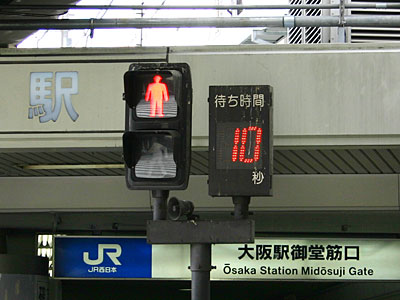 そもそもの成り行きは、車道の信号が黄色になったら車が来ないのを見越して渡り始める歩行者が多く危ないということで、歩行者の待ち時間のイライラを解消するためにつけたそうですが、この「待ち時間」を秒数で表示してしまうあたりがすでに大阪人的感覚です。