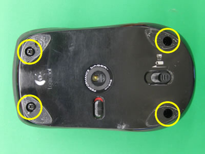電池ボックス側にあるT6のTorxネジを外したくなりますが(苦笑)、基板は裏側からマウス底部を外すと取出せるので、裏側のスライダになっているプラスチックの薄板を慎重に剥がし(後で貼り戻すため)、隠れていた4ヶ所の+ネジを緩めてマウス底部を外します。