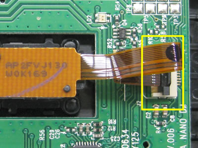 注意するのはそのまま引っ張って抜くのは御法度だということ。フラットケーブルを固定するためのロック機構がありますので、ケーブルの挿さっている上面の黒いパーツをピンセットなどで引き起こします。引き起こすとフラットケーブルのロックが外れるのですんなりフラットケーブルを抜くことができます。センサーは静電気に弱いレーザーダイオードが使われているはずなので、抜けたケーブルの扱いには注意が必要で、不用意に端子部分に触らないようにします。