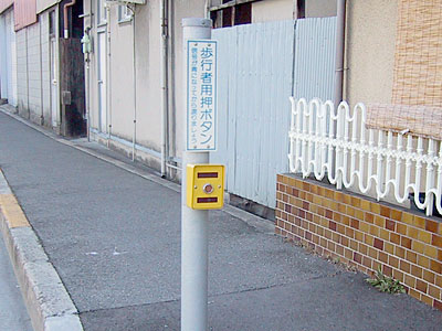 まったくもってトマソンです。歩道から、ただ、押しボタンを押させるためにのみ生えている鉄柱。