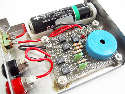 今ならばこの程度の雑に作っても大丈夫な回路は、紙フェノールのユニバーサル基板で作成しますが、これは当時の社内にあった試作基板である両面スルーホールのガラスエポキシ基板のハギレをもらったものでしょう。ねじの頭を外に出したくないので、スイッチすらボンド止めされています(笑)。もちろん基板を止めるスペーサーもボンド止め。電池ホルダーはポリエチレン製なので、合成ゴム系ボンドではちゃんと接着できていません。