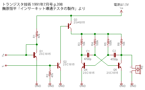 電流源をミラーされるトランジスタのベースで受け、そのトランジスタともう一つのトランジスタでインバーテッドダーリントン回路を構成して増幅、出力で無安定マルチバイブレーター回路を駆動し、圧電素子を鳴動させるという仕掛けです。0.6V以上で導通がある場合ですので、ゲルマニウム素子を除くシリコンダイオードやトランジスタ、TTLロジックなどのシリコン素子の影響を受けずに導通をチェックできるようになっているわけです。