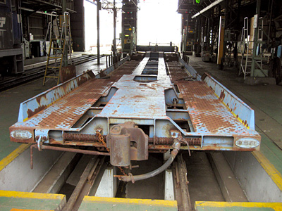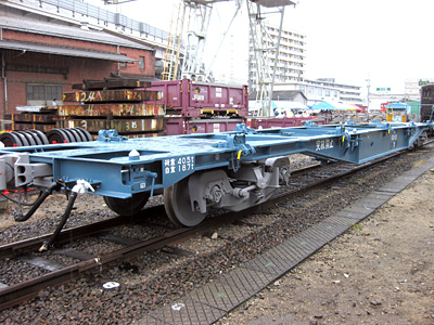 クラ9000形貨車から運送トラックを直接搭載した搬送をするピギーバック型輸送車両として改造された車両ですが、試験運用において搭載トラックによる荷役の制限、高さの制限のほか、積み下ろしににおける手間などから実運用に至らなかった貨物車輛です。現存するのは展示されていたこのインクブルーの一台だけとなります。