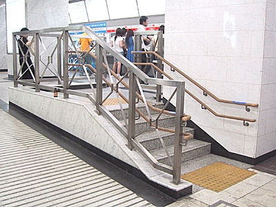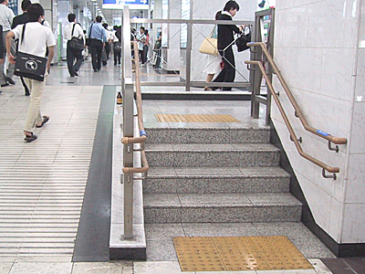 なんだか切符売り場や通行客にしてみればいい迷惑な階段です。上るにしては段数が少なすぎ。スロープを利用しなければならない障害者の人にしてみれば遠回りさせられて、こちらもいい迷惑な階段です。今後改良工事の結果でどのように変化するのか・・・。
