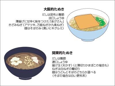 大阪で「きつね」と「たぬき」というと表裏一体で、「きつね」はかならずうどんであり、「たぬき」は必ずそばでなければなりません。「たぬき」を注文して「うどんですか?そばですか?」と聞かれることは大阪が日本の首都になったとしても絶対あり得ません。元は「きつねうどん(けつねうろん)」であり、甘辛く味付けをした薄揚げがのっており、油揚げは狐の大好物ということで、このうどんは「きつねうどん」となる訳です。