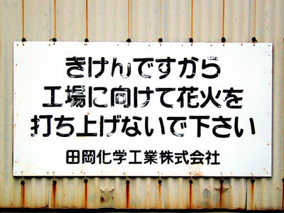 これはかなり内容が強烈です。なんといっても工場に向けて花火を打ち上げないでください、と書かれています。しかもこの看板はかなり高い塀に掲げられており塀は中を見ることすらできない高さなのです。打ち上げ花火を撃ち込もうとしても容易ではありません(絶対にしないでください)。
