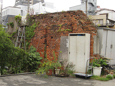 建物の隙間にひっそりと存在するレンガ壁。