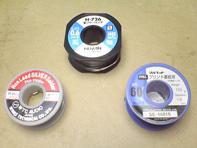 左から音響用銀ハンダSR-4NCu、鉛フリーハンダH-726、一般用の鉛40%・錫60%ハンダ