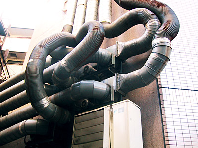 2007年1月2日 なんぎ 迷走 うわ、なんだこれは?! スパゲティダクト どうも排気のためか何かのダクト類なのですが、この角で立ち上げて上へ通す際にファンを使って強制送気しているようで、そのファンを取り付けるためのパイプの取り回しがこんな状態。 別の角度から見ると送気ファンが見えますが、やはりすごい。 スパゲティの中の秩序 各ダクトに1つのファンが付けられている 整然とした無秩序状態。 これはもはやトマソンだろうかと。