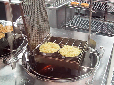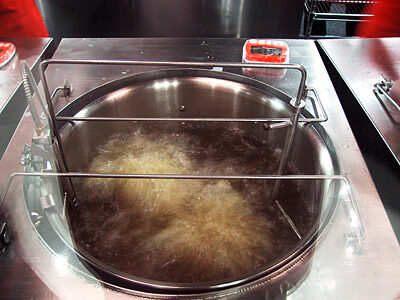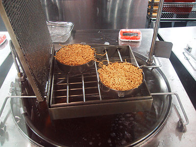 約160℃の油で約2分半揚げる「瞬間湯熱乾燥」行程である