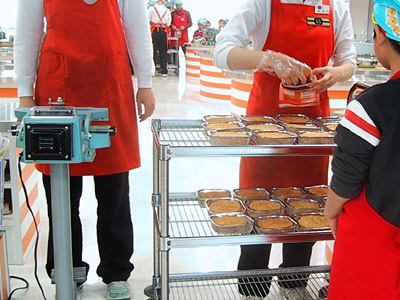 写真を撮りながらと思っていたのですが、実際に作る行程を開始してしまうと衛生管理のため他のものを触れません。モチロン、デジカメも使えず。もっとも手が粉だらけで触ることもできない状態です。残念ながら主たる行程をここでご紹介できませんが、インスタントラーメン発明記念館のサイトで詳細に紹介されていますので、大変恐縮ですがそちらでご確認ください。
