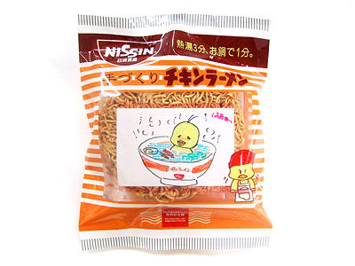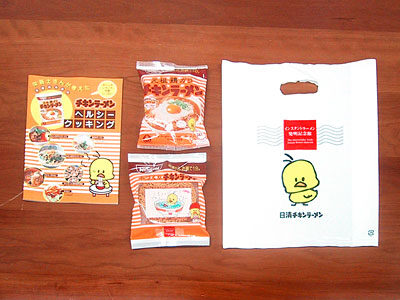 このようにして出来上がったオリジナルのチキンラーメンのほか、工場で量産されたメーカー製チキンラーメン1袋、それに体験中に頭に巻いていたひよこチャンのバンダナを、お土産としてもらって帰ることができます。